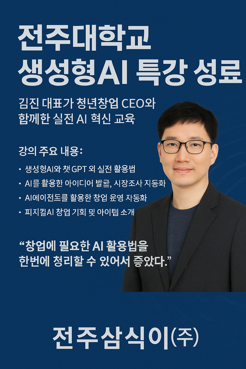 #전주대학교AI특강 #전주삼식이 #김진대표 #생성형AI교육 #챗GPT강의 #청년창업CEO #전주대학교창업 #AI에이전트교육 #피지컬AI #전북AI교육 #전주AI강사 #전북창업교육 #AI스타트업교육 #전주창업센터 #전주삼식이주식회사