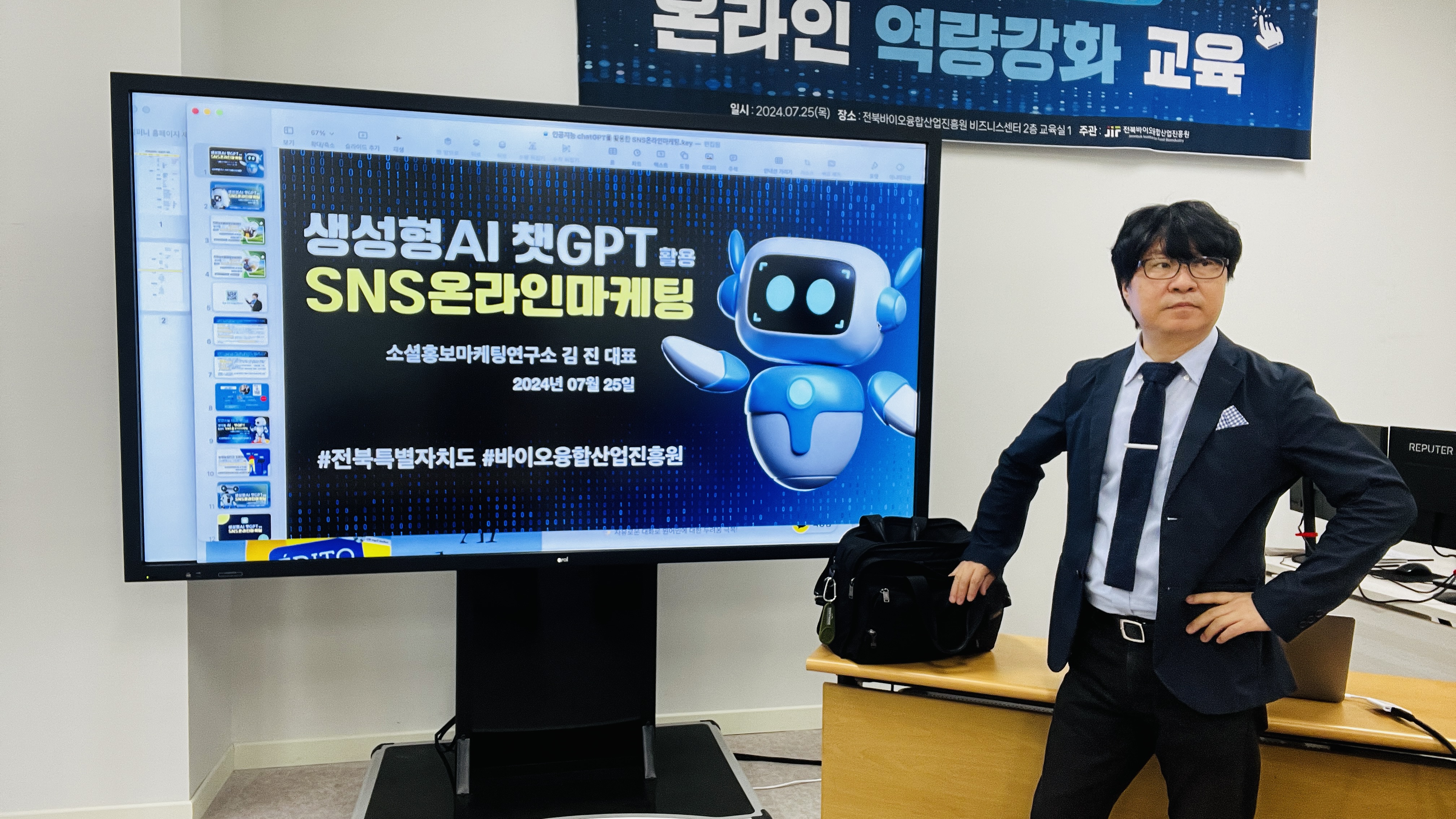 안녕하세요, 여러분! 전주삼식이 대표 김진입니다. 저는 생성 AI Chat GPT를 활용한 SNS 콘텐츠 마케팅 전문 강사로서, 청년농업인, 귀농귀촌인, 정보화농업인 여러분께 유용한 정보를 제공하기 위해 이번 교육에 참여하게 되었습니다.